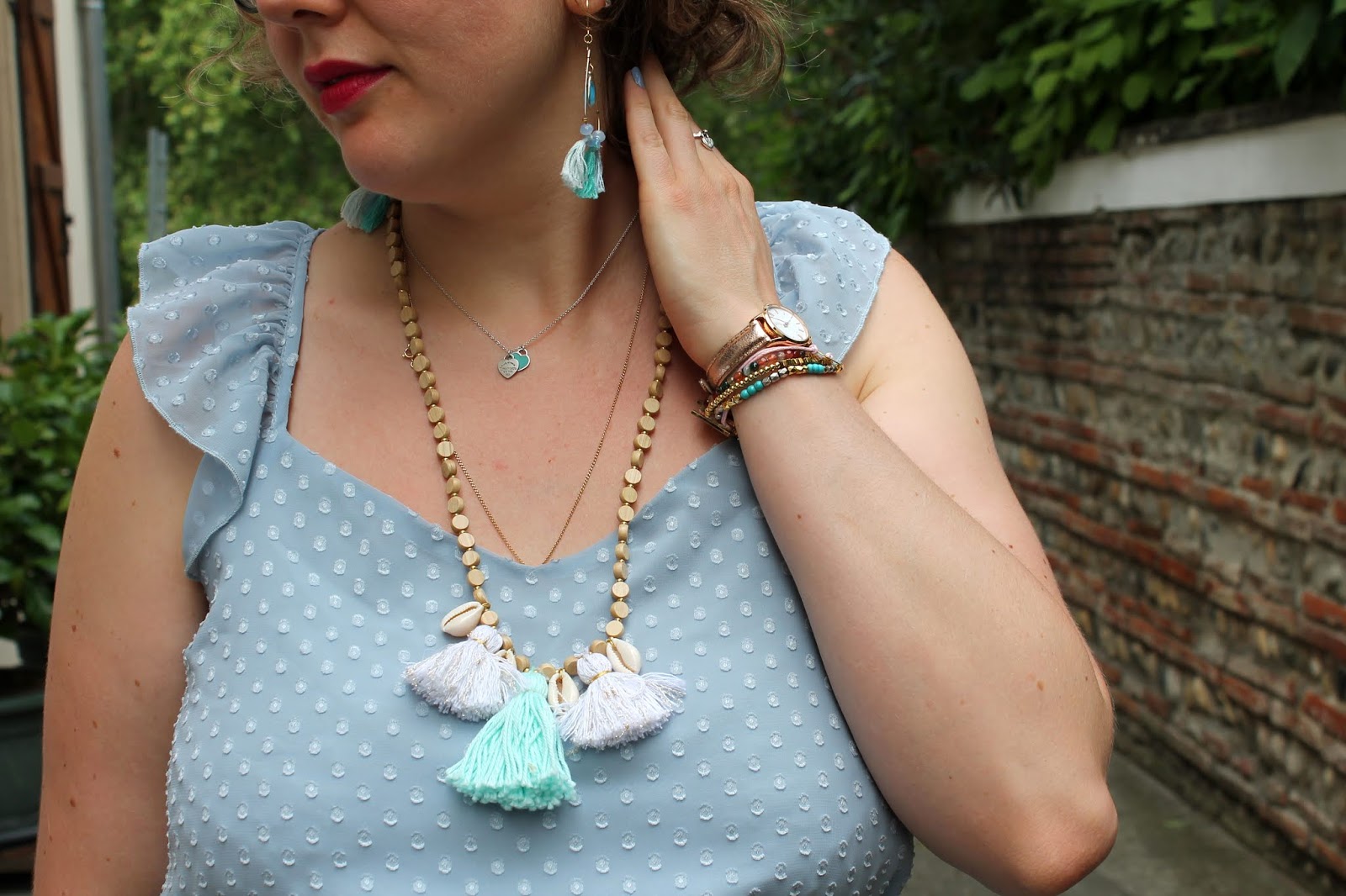 Côté bijoux, j'ai acheté pour l'occasion un sautoir en perles de bois et pompons bleu et blanc à la ravissante Léa qui crée des bijoux sous le nom de L.Kentéa, elle le sait je suis totalement fan de ses colliers et j'en commande un par collection !